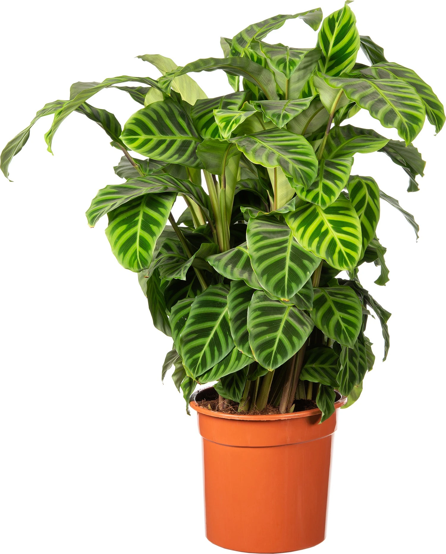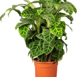 Een Calathea is niet alleen maar een mooie plant om naar te kijken, hij heeft ook nog eens een luchtzuiverende werking, waardoor het een geschikte plant is voor zowel de woonkamer als het kantoor. Zet de plant op een lichte plaats, maar niet in de directe zon. Een plek wat verder in de kamer vind hij ook prima. De Calathea zebrina lijkt wel iets op een zebra door de gestreepte tekening op de groene bladeren met een lichtere onderzijde. Deze decoratieve plant kan een schaduwhoek goed opfleuren.