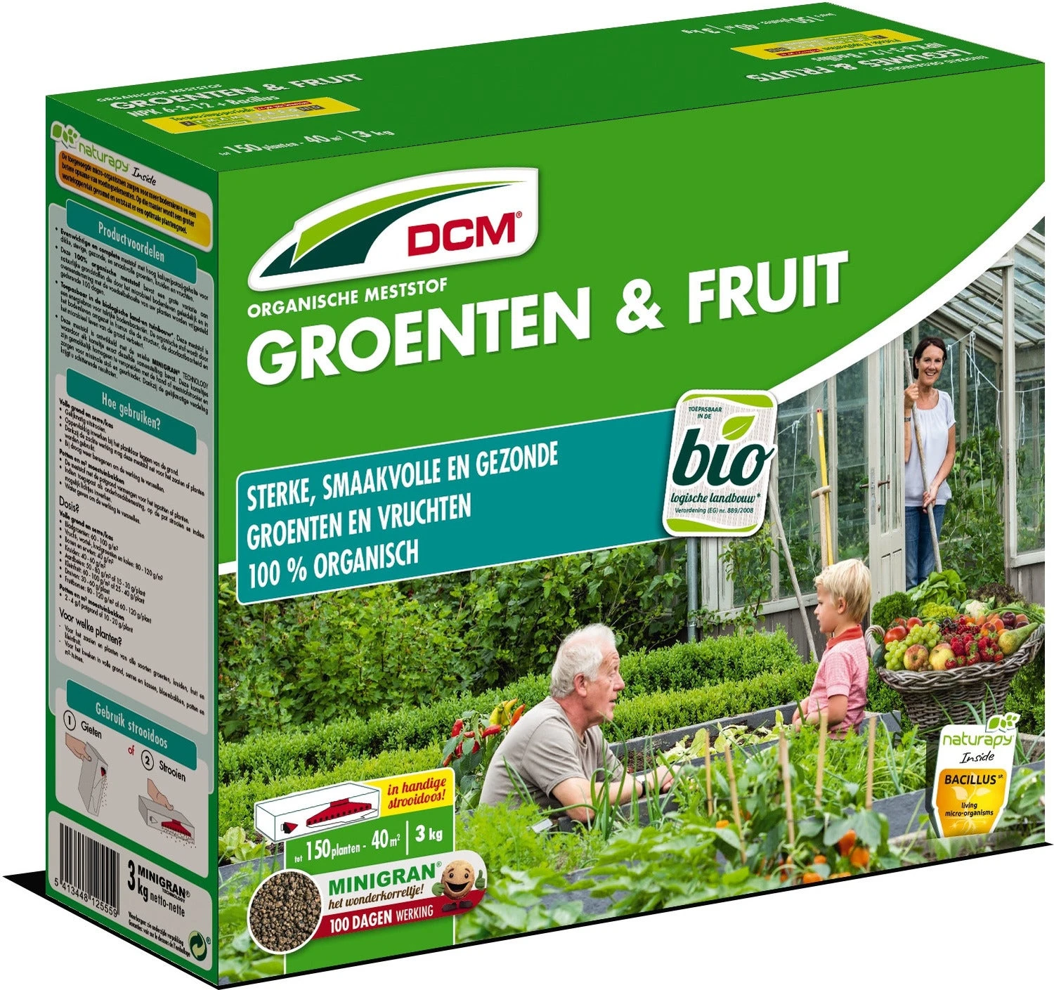 Deze meststof bevat extra veel kalium waardoor jouw groenten, kruiden en fruit snel groeien. Daarnaast zijn micro-organismen toegevoegd die de opname van de meststof verbeteren en ervoor zorgen dat er een groter worteloppervlak ontstaat. Het resultaat? Een moestuin die er prachtig bij staat! Een ander pluspunt van deze meststof is dat deze uit Minigran-korreltjes bestaat. Hierdoor wordt de voeding tot 60% beter verdeeld over de volle grond. Gebruik DCM meststof groenten en fruit 2 keer per jaar: één keer in de periode februari tot en met mei en één keer in de periode juni tot en met oktober. Gebruik daarbij 0,4 – 1,2 kg per 10 m2.