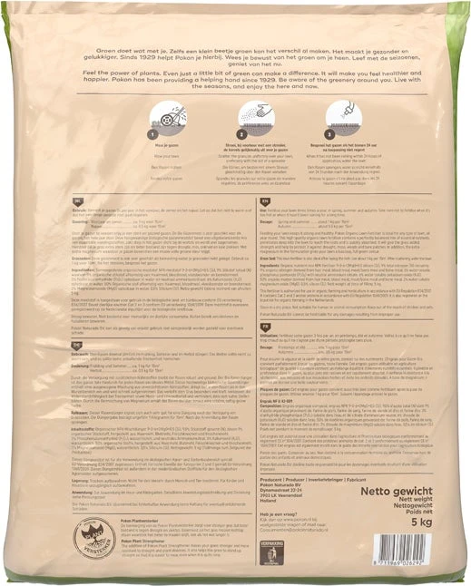 Pokon Bio Gazonmest is verkrijgbaar in verschillende verpakkingen. Afhankelijk van het formaat van de verpakking is het voldoende voor de behandeling van 15m2, 30m2, 75m2 of 125m2.