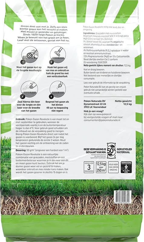 - Strooi Pokon Gazon Revolutie uit over het te behandelen oppervlak. Zaai eenmaal over de lengte en eenmaal over de breedte.